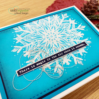 This giant snowflake can be moved around to create different looks and works for both orientations for an A2 sized card. For a couple of the cards, I splattered some Perfect Pearls to create a little more dimension and others I used some silver string. This snowflake is bold enough to stand on its own or you can add fine details. This Colossal Snowflake comes with big ideas!