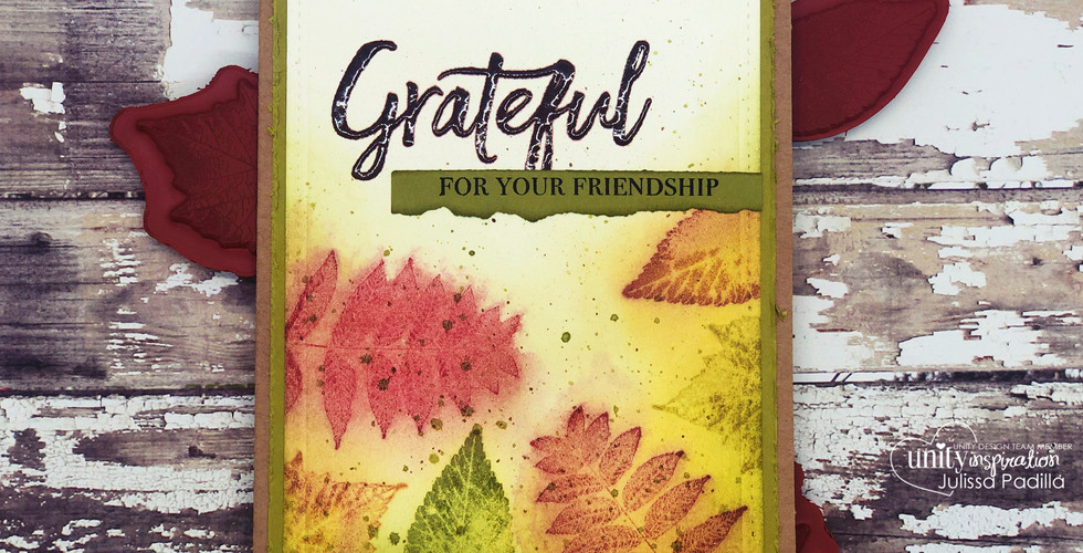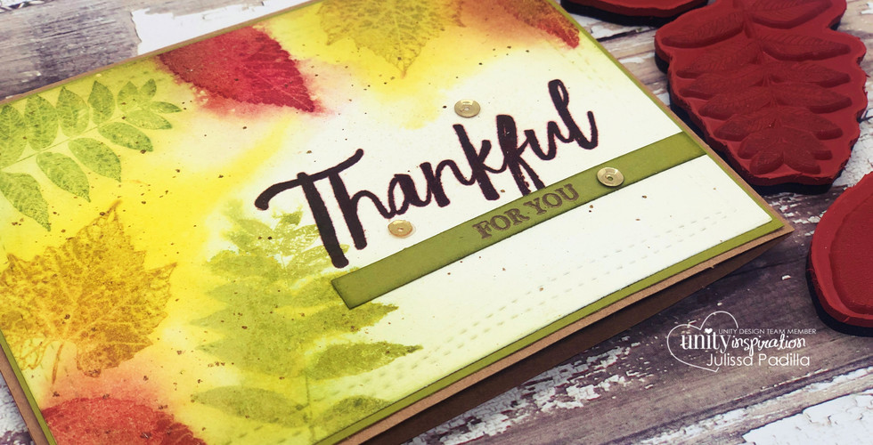 Today, I am sharing two cards made using Unity Stamp Company's "...Thankful and Grateful Fall" stamp set. The leaves in this stamp set are somewhat distressed looking so I thought, how great would be to use Distress Inks with water to give them a faded look. Here's how it worked.